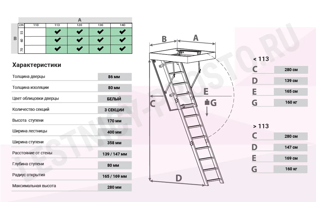 Максимально утеплённая чердачная лестница из массива сосны высокого качества. Складная, трёхсекционная (до 280 см) или четырехсекционная (до 335 см).