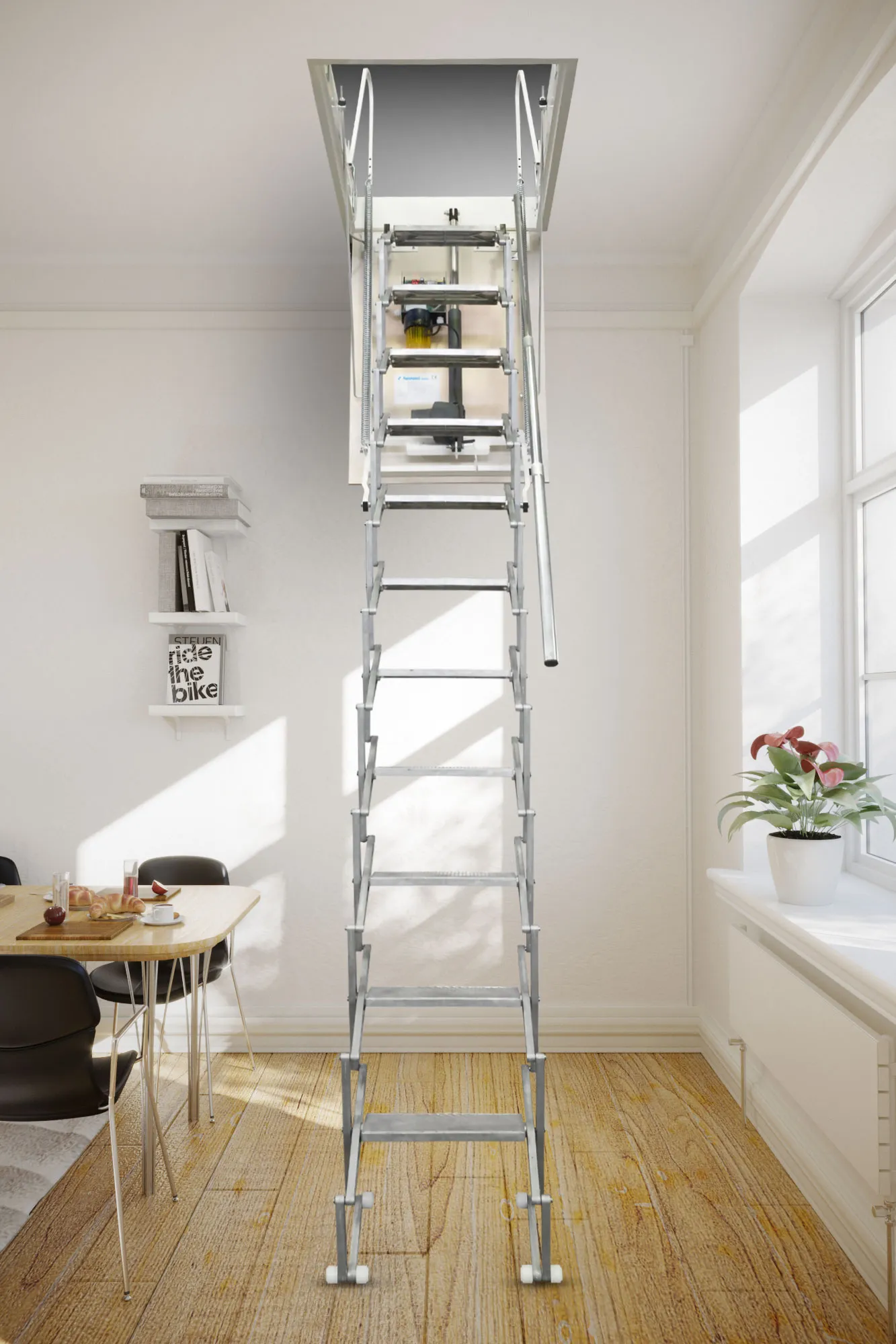 Лестница складная трёхсекционная, изготовлена из сосны. Термоизоляционная крышка типа "сэндвич" утеплена пенопластом, облицована с двух сторон ДСП белого цвета. Короб люка с однослойным уплотнителем. Все металлические элементы лестницы покрыты порошковой краской, ступени лестницы имеют антискользящие насечки и закреплены в столярное соединение «ласточкин хвост», что позволяет выдерживать нагрузку до 150 кг. Деревянный стержень для открывания лестницы в комплекте.