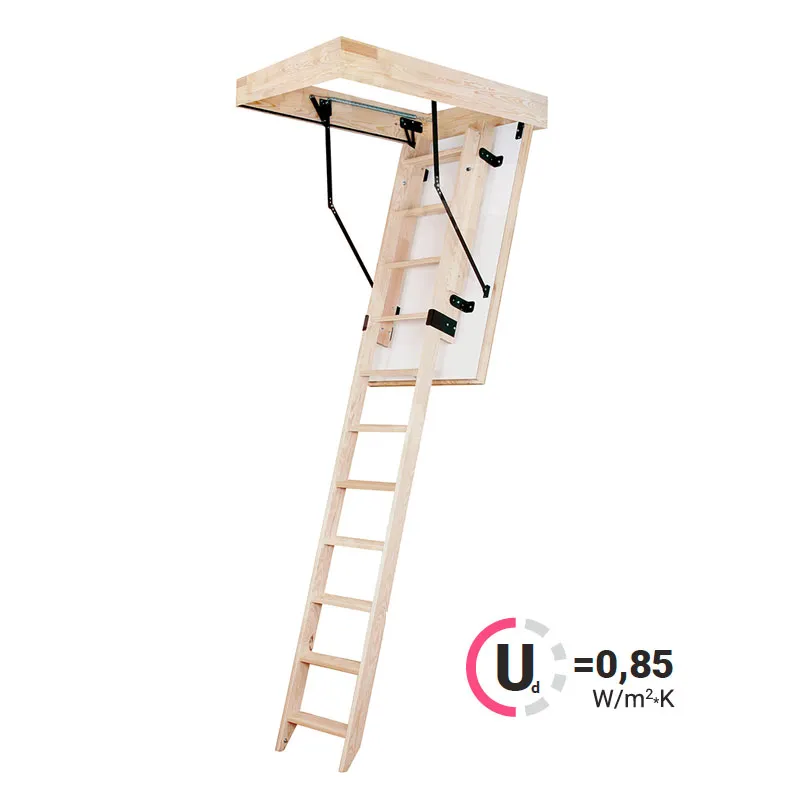 Лестница складная трёхсекционная, изготовлена из сосны. Термоизоляционная крышка типа "сэндвич" утеплена пенопластом, облицована с двух сторон ДСП белого цвета. Короб люка с однослойным уплотнителем. Все металлические элементы лестницы покрыты порошковой краской, ступени лестницы имеют антискользящие насечки и закреплены в столярное соединение «ласточкин хвост», что позволяет выдерживать нагрузку до 150 кг. Деревянный стержень для открывания лестницы в комплекте.