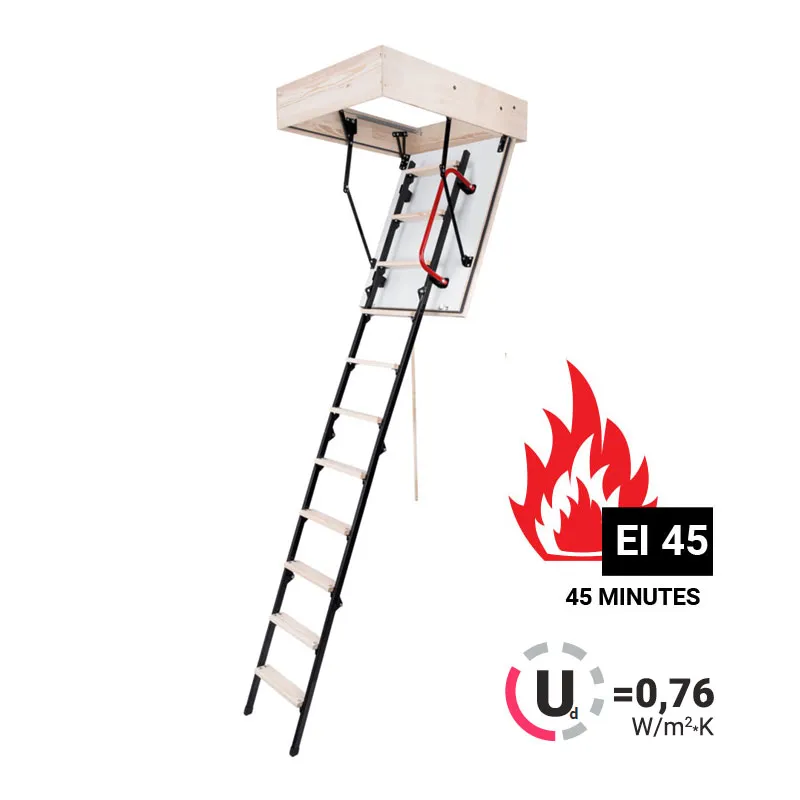 Складная 4-х секционная чердачная лестница. Рабочая поверхность полностью выполнена из алюминия. Термоизоляционная крышка типа "сэндвич" имеет усиленную теплозащиту, облицована с двух сторон ДВП белого цвета. По контуру короба имеется уплотнитель; Все металлические элементы лестницы покрыты порошковой краской.