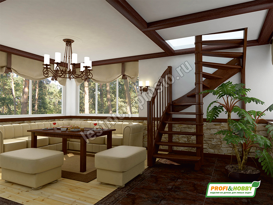 Ступени и поручень лестницы изготовлены из ясеня, остальные элементы из сосны.