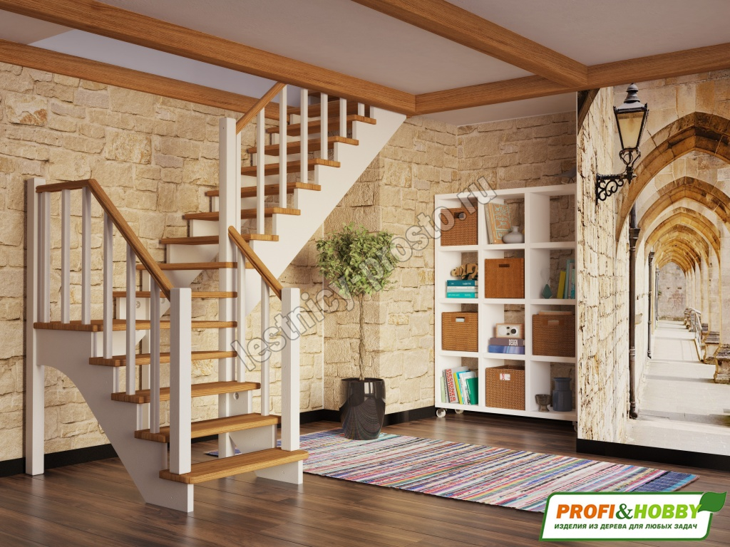 Ступени и поручень лестницы изготовлены из дуба, остальные элементы из сосны. Возможно изготовление данной модели полностью из дуба