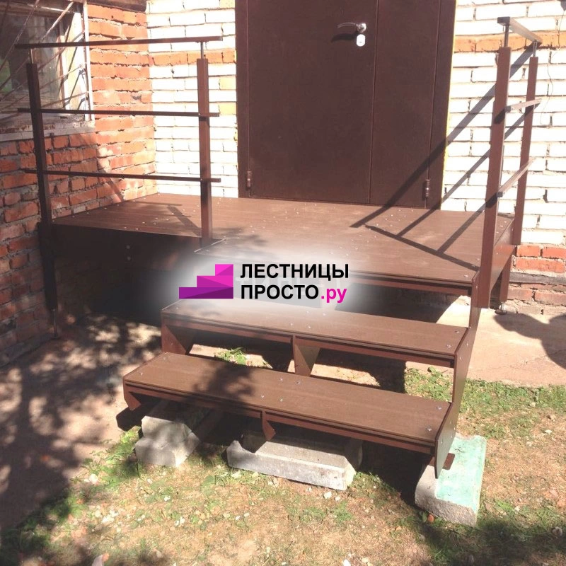 Ступени лестницы состоят из металлической рамки, обеспечивающей необходимую прочность, и покрытия из террасной доски ДПК (древесно-полимерный композит). Ступени не боятся воды и мороза, не теряют со временем свой внешний вид и не требуют ухода.