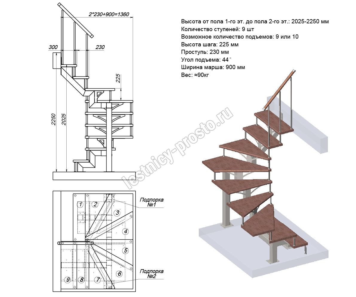 Высота лестницы 2025 - 2250 (9 ступеней) мм