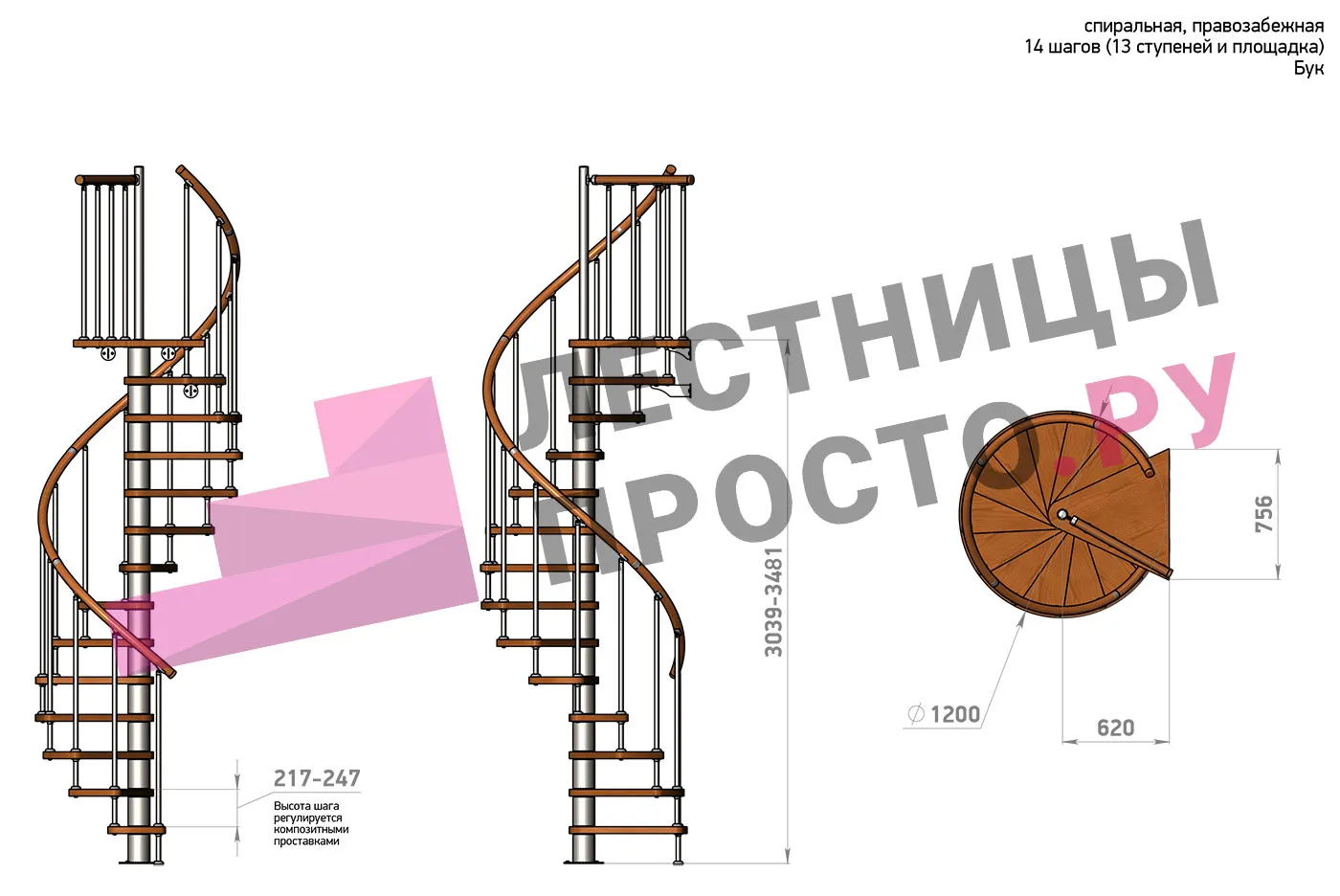 Винтовая лестница Prosto Spiral Black D120см, h303.9-348,1 см, бук