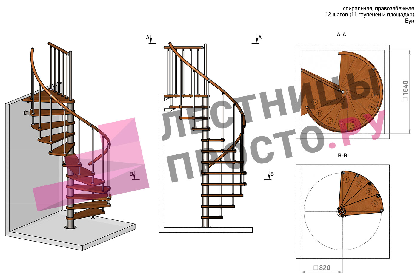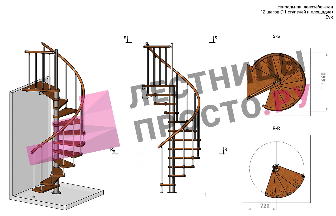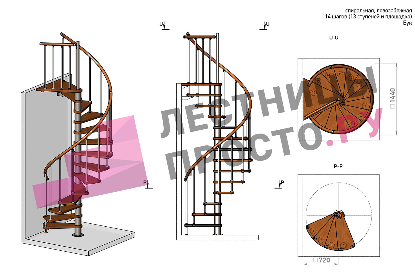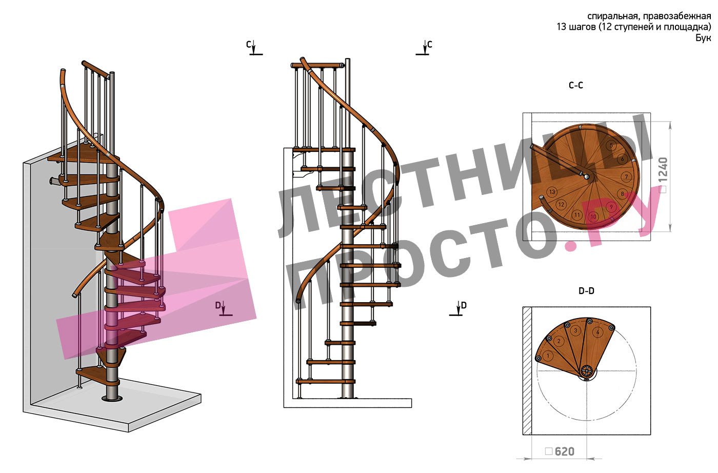 Винтовая лестница Prosto Spiral Black D140см, h282.2-326,3 см, бук |