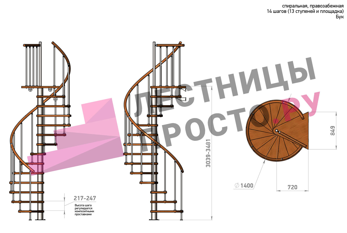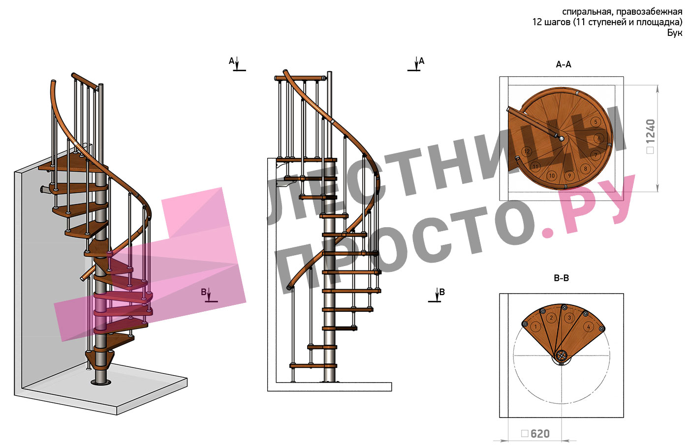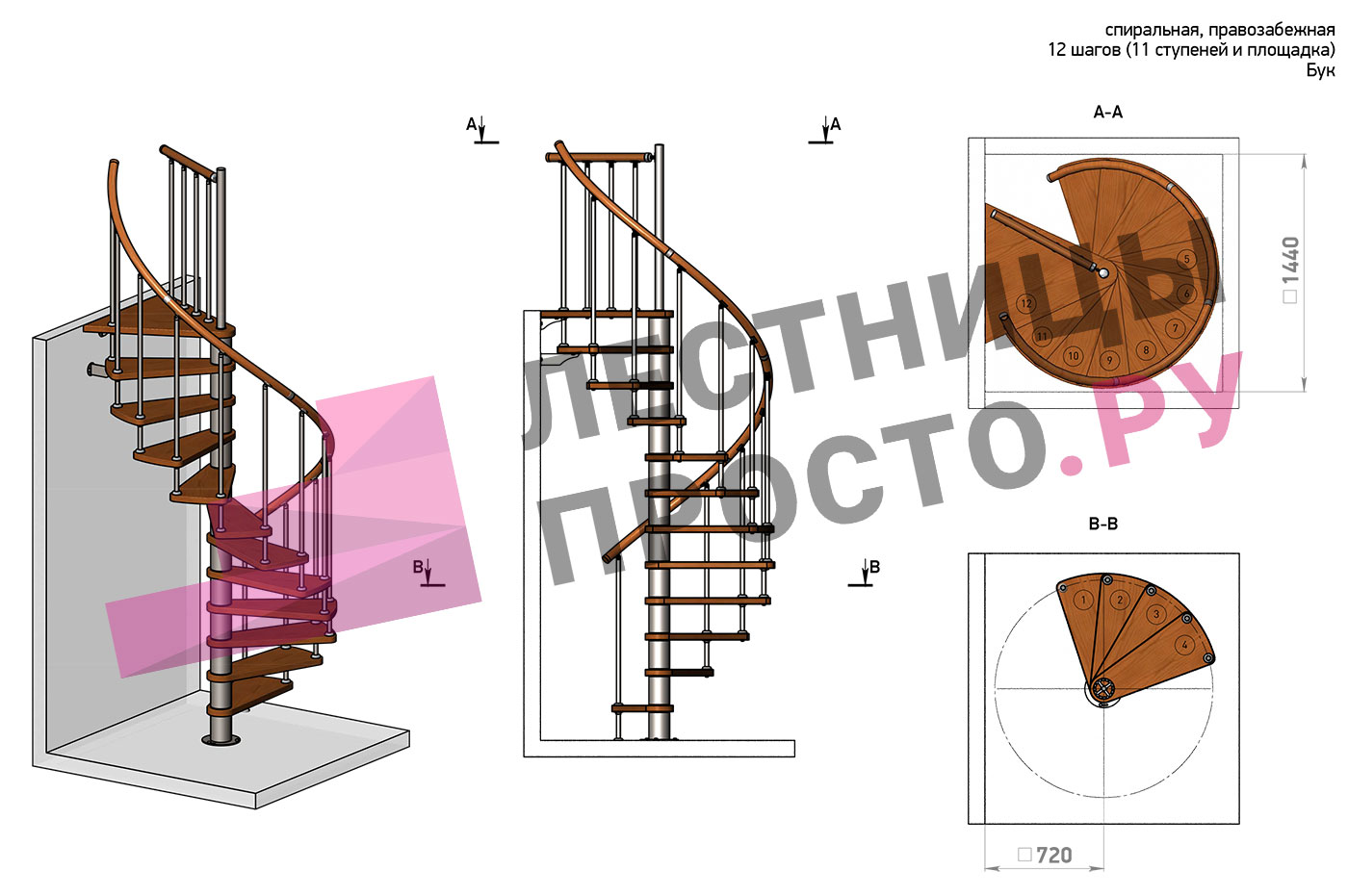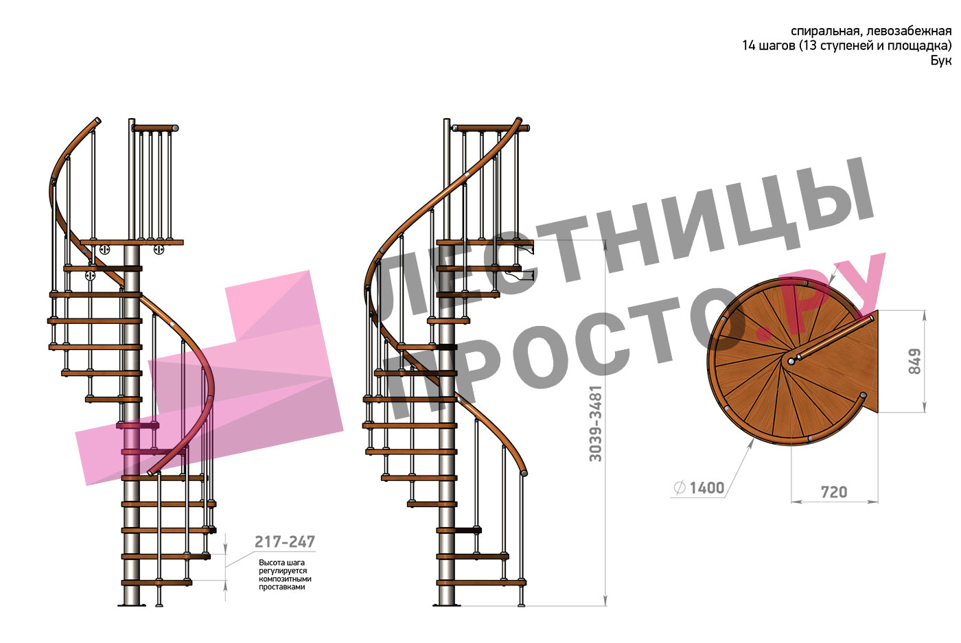 Винтовая лестница Prosto Spiral Black D140см, h282.2-326,3 см, бук |