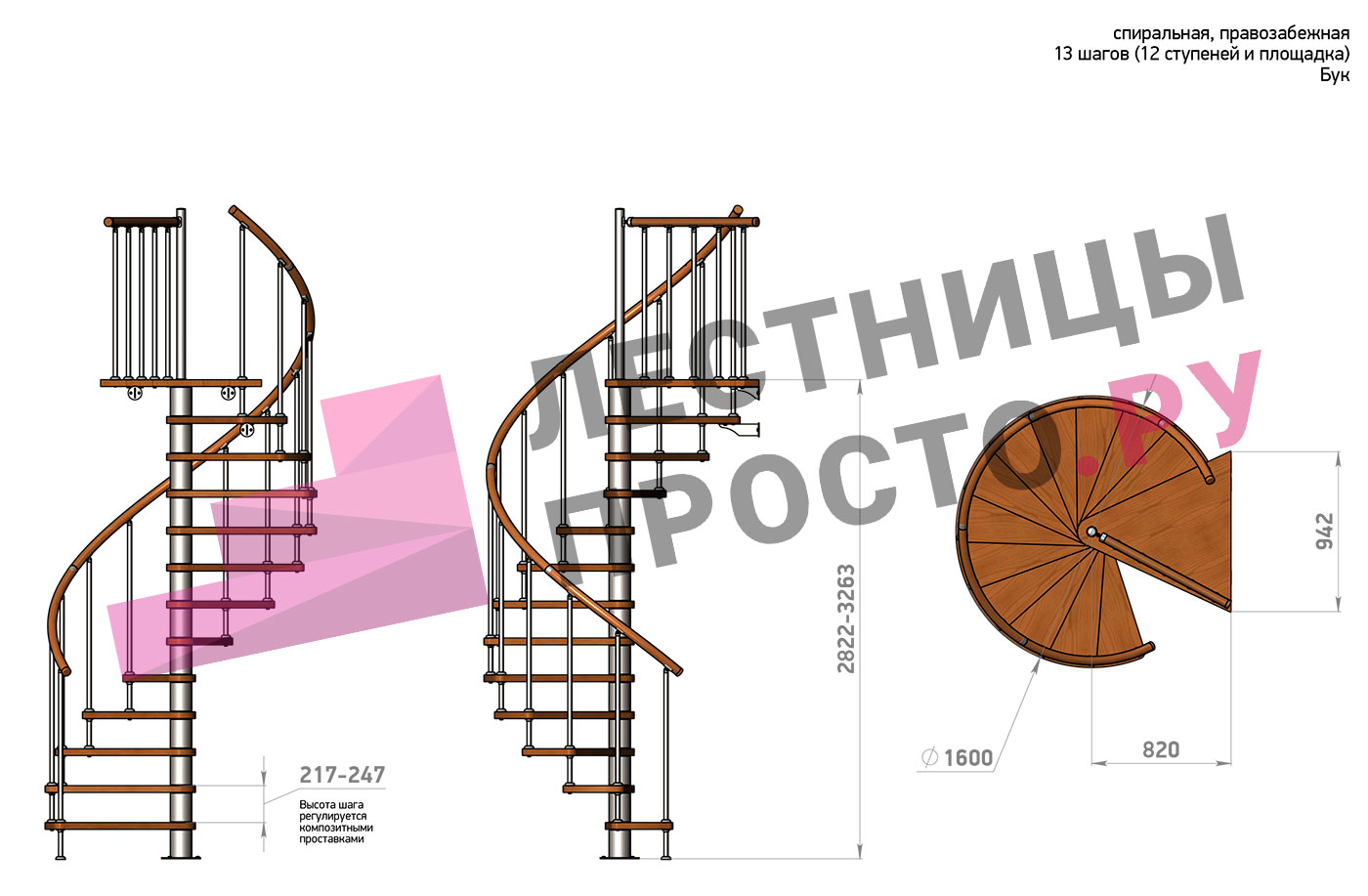 Винтовая лестница Prosto Spiral Black D160см, h282.2-326,3 см, бук |