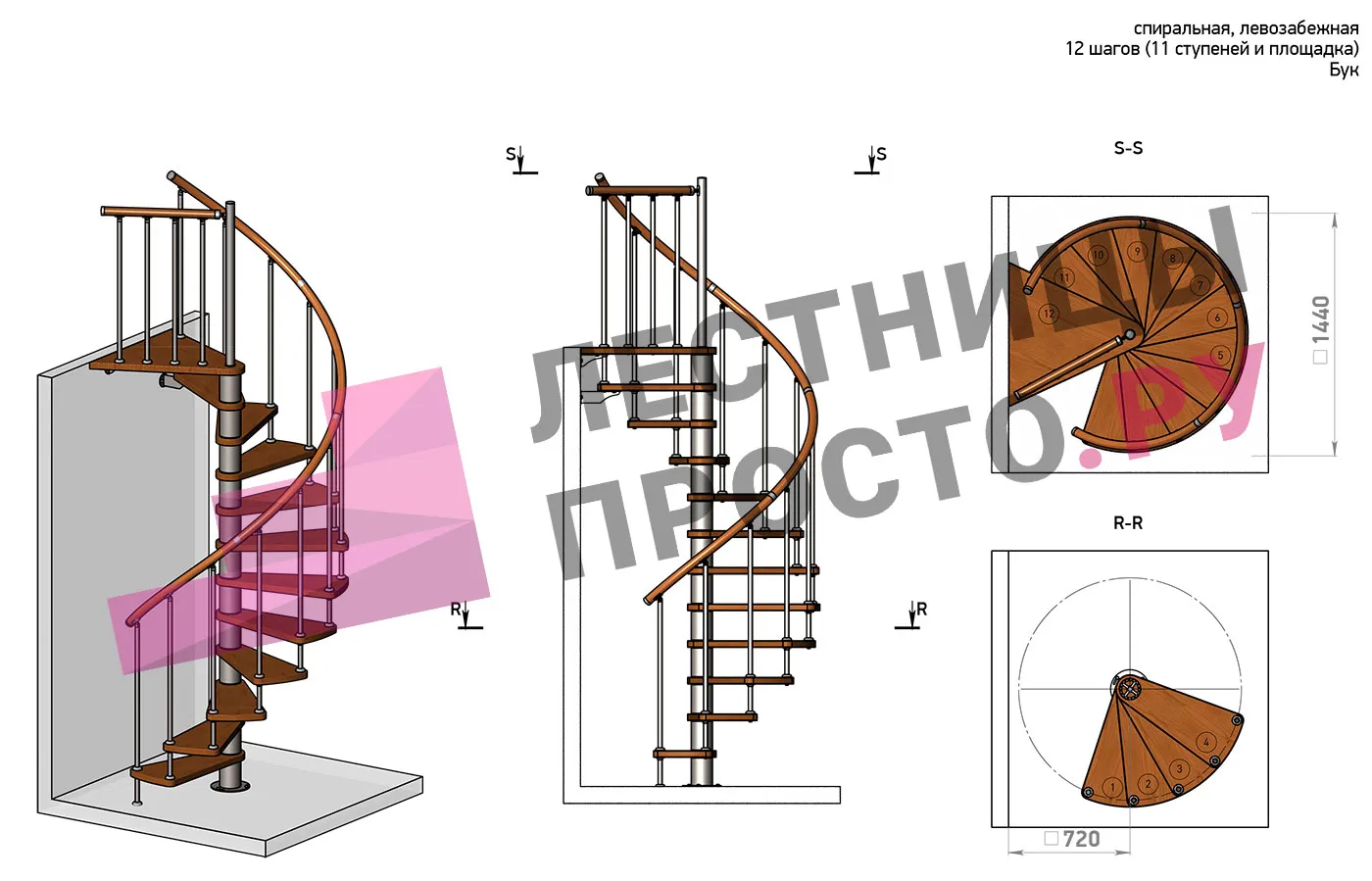 Левая, d=120см, 12 ступеней + площадка